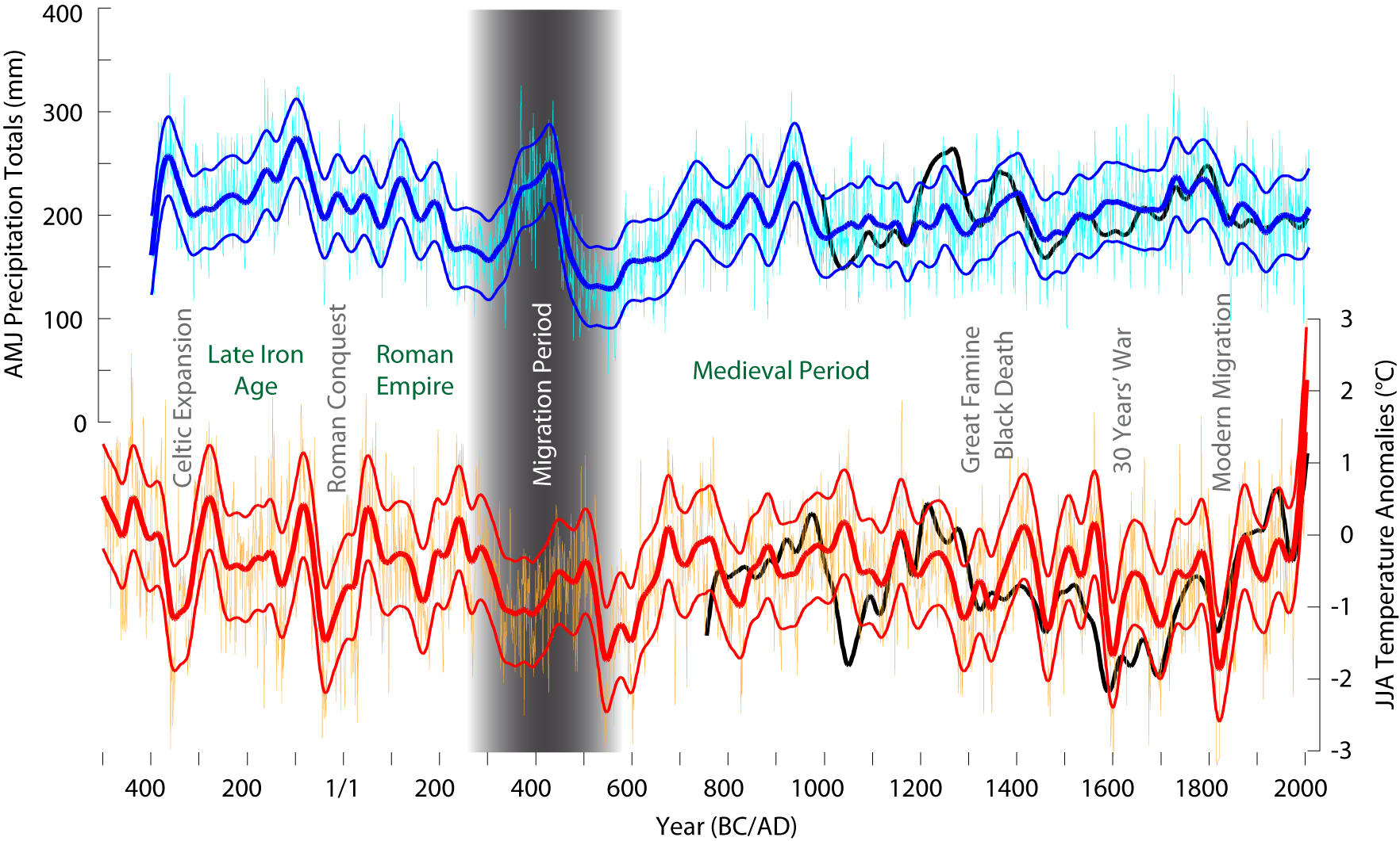 In this project, we will perform the first systematic extraction of climatic information contained in over 9000 oak and silver fir tree ring series spanning the past 3000 years.